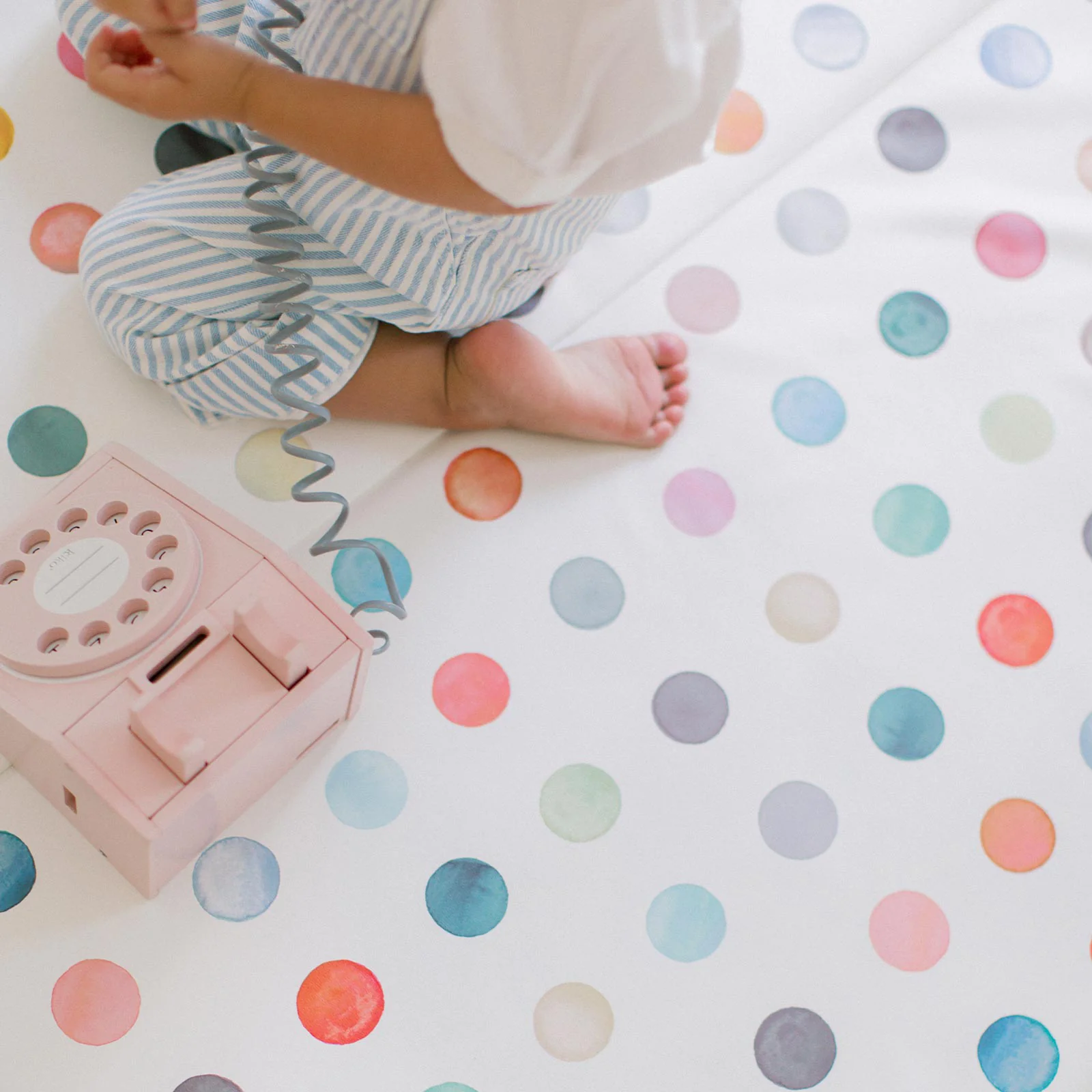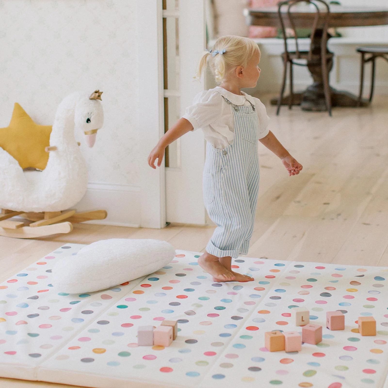 | Designed for their next stage of play, the Dottie Tumbling Mat in Gloria offers the perfect balance of comfort, fun, and functionality. With a generous layer of memory foam, this mat supports every little roll, tumble, and jump, ensuring soft landings for all types of play. Wrapped in a hand-illustrated, wipe-clean cover with a vibrant watercolor rainbow dot print on a white base, it brings playful energy to any space. Lightweight and foldable, this mat is ideal for indoor or outdoor use and can be easily stored away when not in use. Safe for all ages, it’s the perfect mat to encourage active play while enhancing your home’s style.